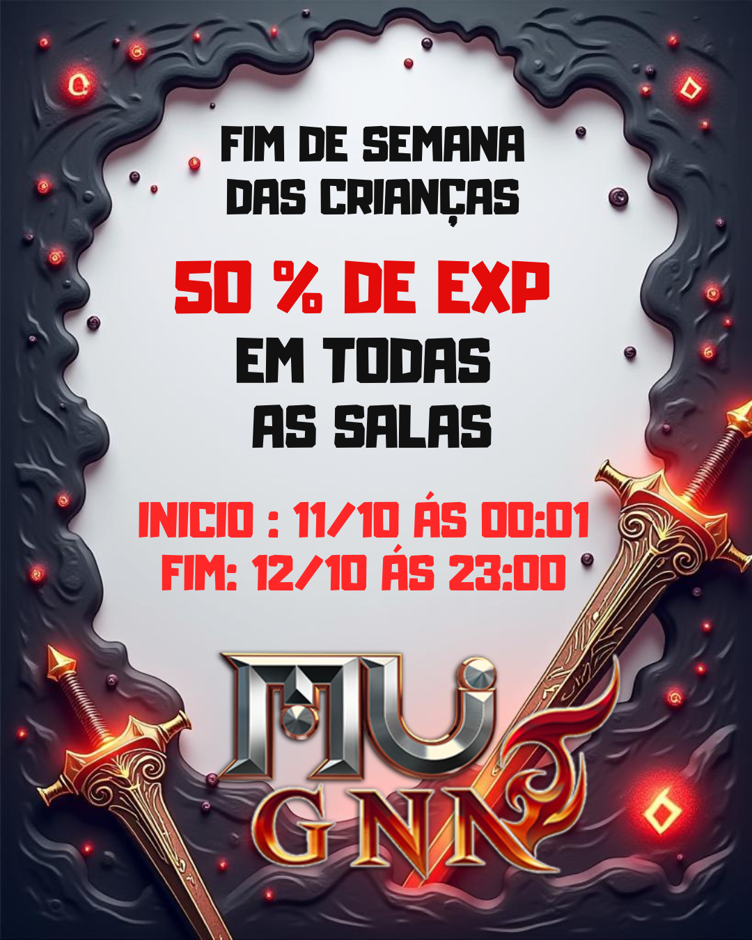 O que rola: 50% de EXP BONUS em todas as salas do servidor MuGNN!